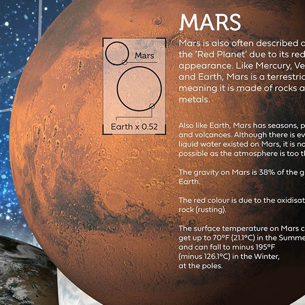 A striking solar system mural for your school's science department wall. Featuring the Sun and the eight planets that make up our solar system. Mercury, Venus, Earth, Mars, Jupiter, Saturn, Uranus and Neptune. Each planet is presented in high resolution and includes planet statistics and information. This can be re-configured to fit just about any wall.